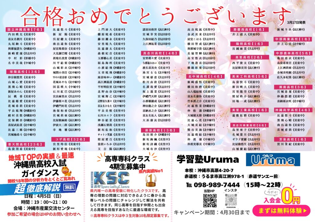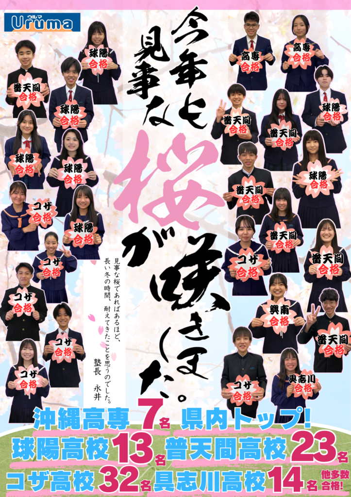 あけましておめでとうございます。学習塾Uruma塾長永井です。 今春、ウルマは18年目に突入します。 18年前、どこの馬の骨かわからない内地から来た私を地域の皆さんが暖かく迎えてくださり、ご指導いただき、おかげ様で塾としても塾長としてもここまで成長させていただいたと皆様に感謝申し上げます。 実績0で開校した18年前、「あなたを実績にします」をモットーに開校いたしました。たった一人の生徒と私の2人だけで始まった空間が、地域の皆様のおかげで、沖縄市内ではトップの実績を収める塾になりました。 年賀状の画像にありますように優秀なスタッフに恵まれ、生徒ひとり一人に合わせた指導「ひとり一人主義」を18年間継続しており、今年も同様に邁進して行きます。指導力も毎回の各中学の定期試験の結果をご覧になっていただければ手前味噌ではありますが、実証されているかと思います。だからこそ安心してお通いいただける塾と自負しております。小・中・高生を一貫教育できる学習塾Urumaを今年もよろしくお願いいたします。 株式会社CONOAZ(コノアス)代表取締役 永井 雅人